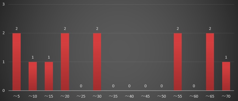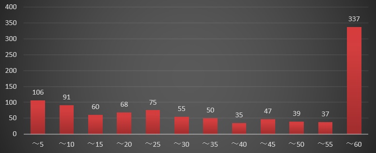 簡単化した抽選確率で1000回の当たりを引き、それぞれ何回目で当たったかを集計した結果は次のようになりました。