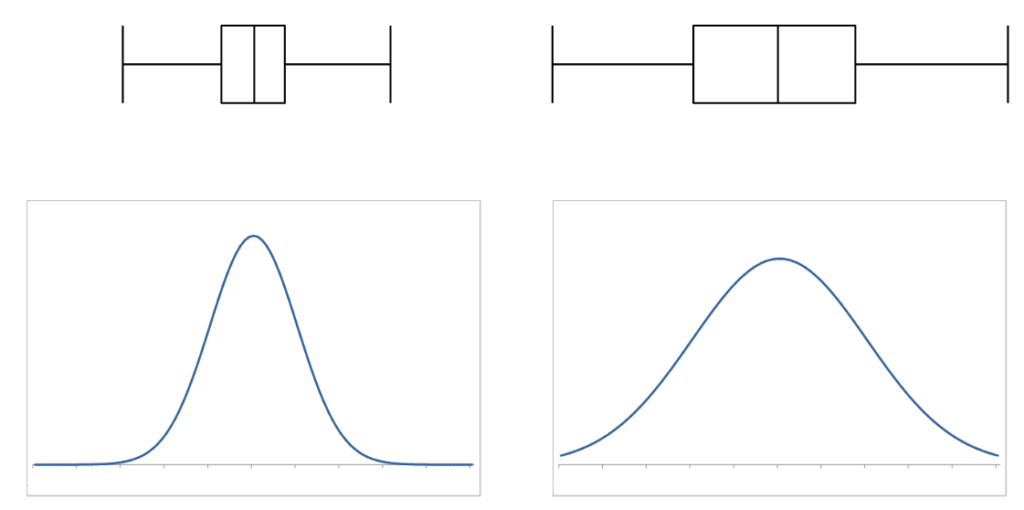 また、次の図からは、箱ひげ図が散らばりを表現するという事が伝わりやすいと思います。