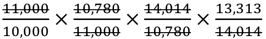 幾何平均の考え方は、「X倍!Y倍!Z倍!これらをならすと、1回あたりは、∛XYZ倍!」というものなので、○倍の形に変換します。